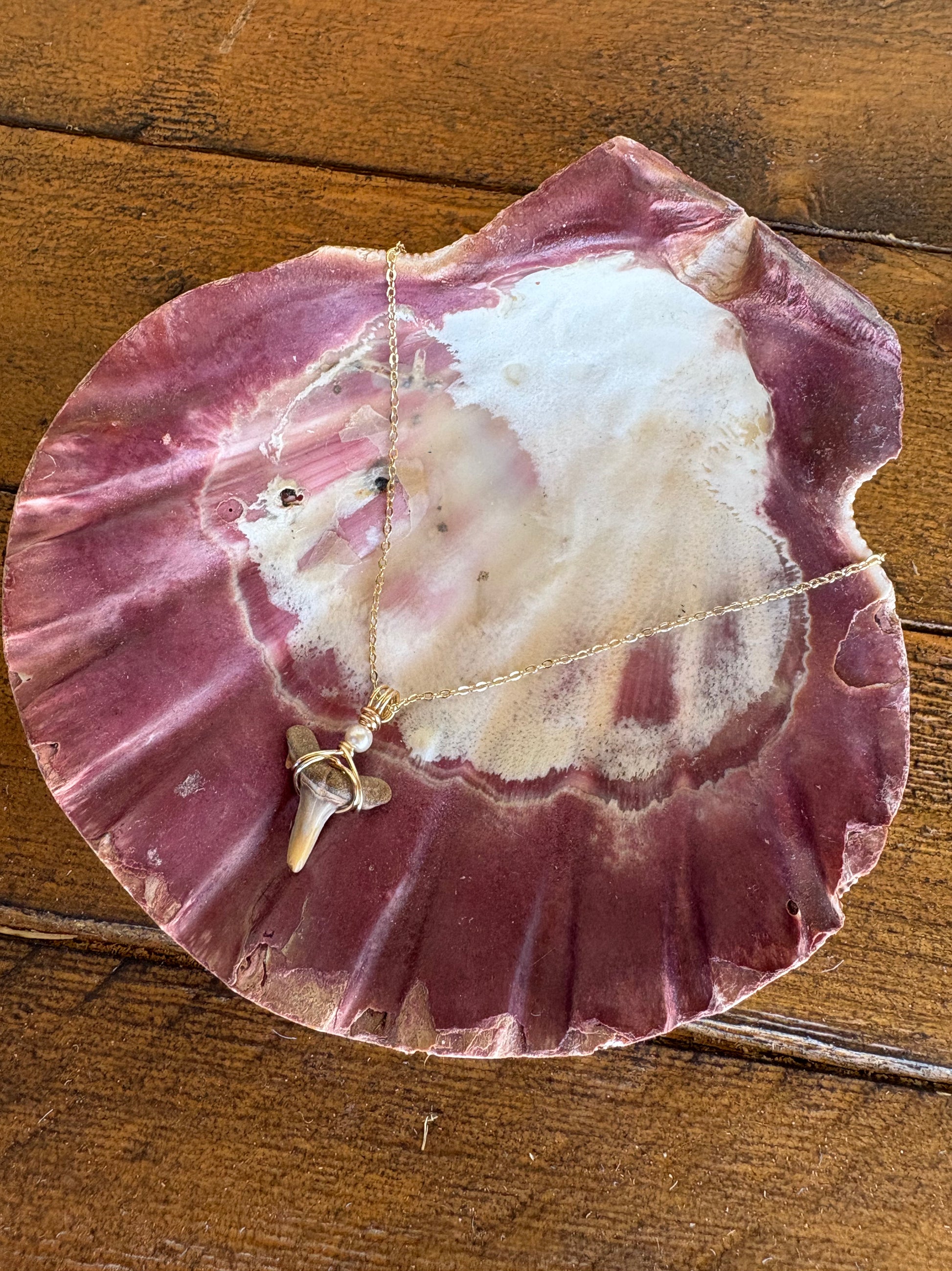 Material: Gold filled 16 in chain, pearl, shark tooth found in Galveston Tx