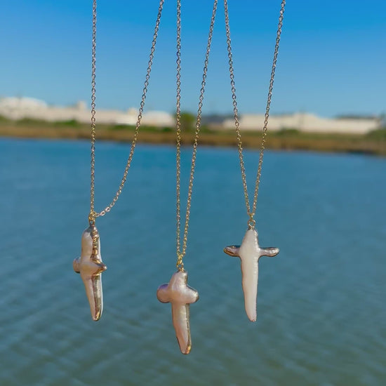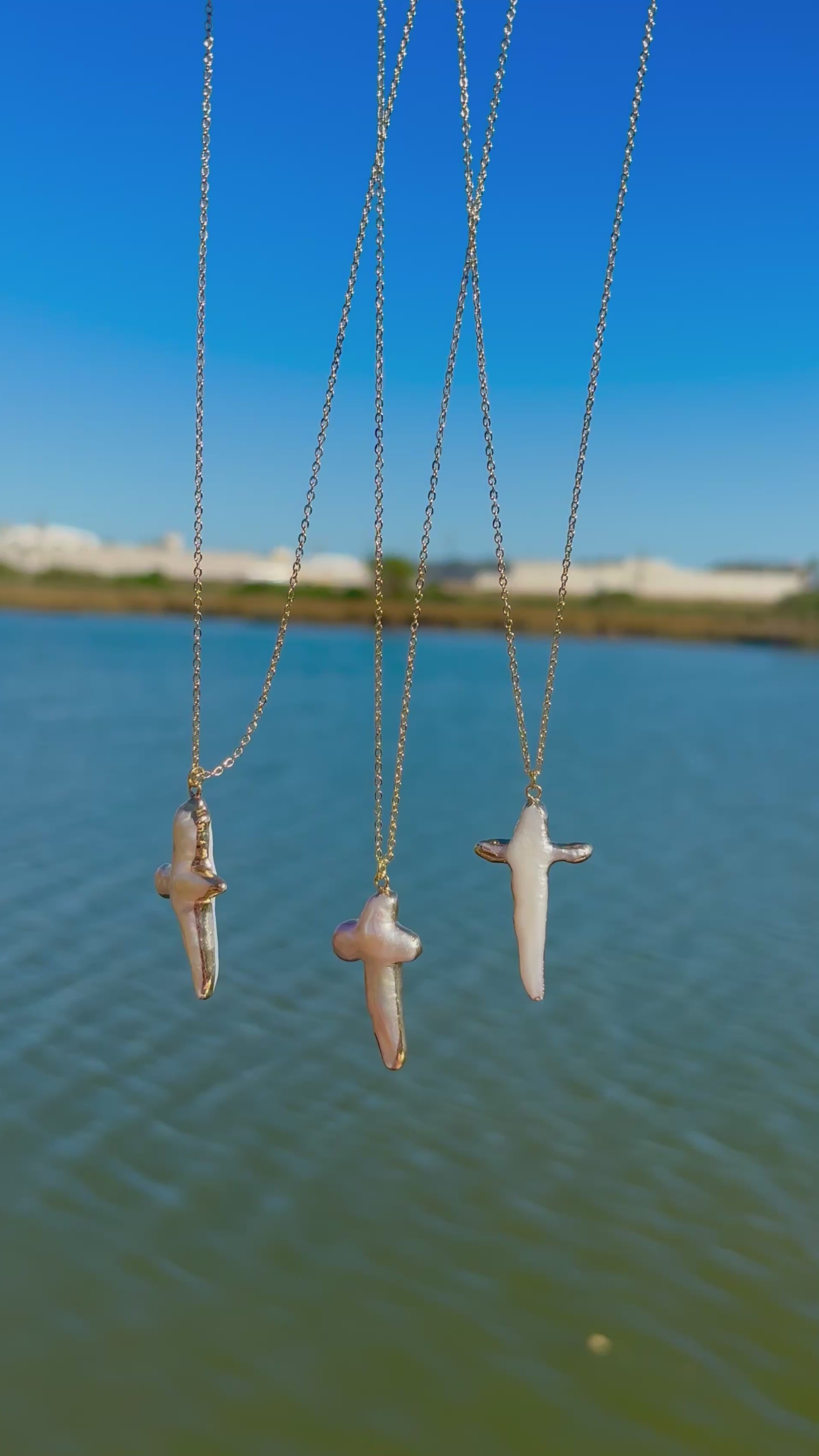 Material:Gold filled 16 in chain, pearled cross with gold trimming